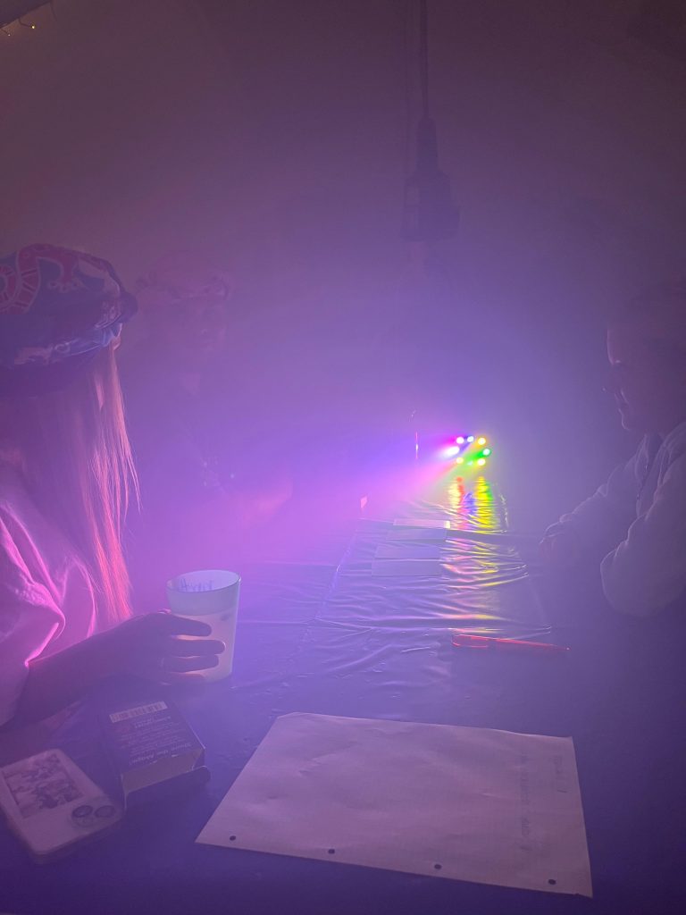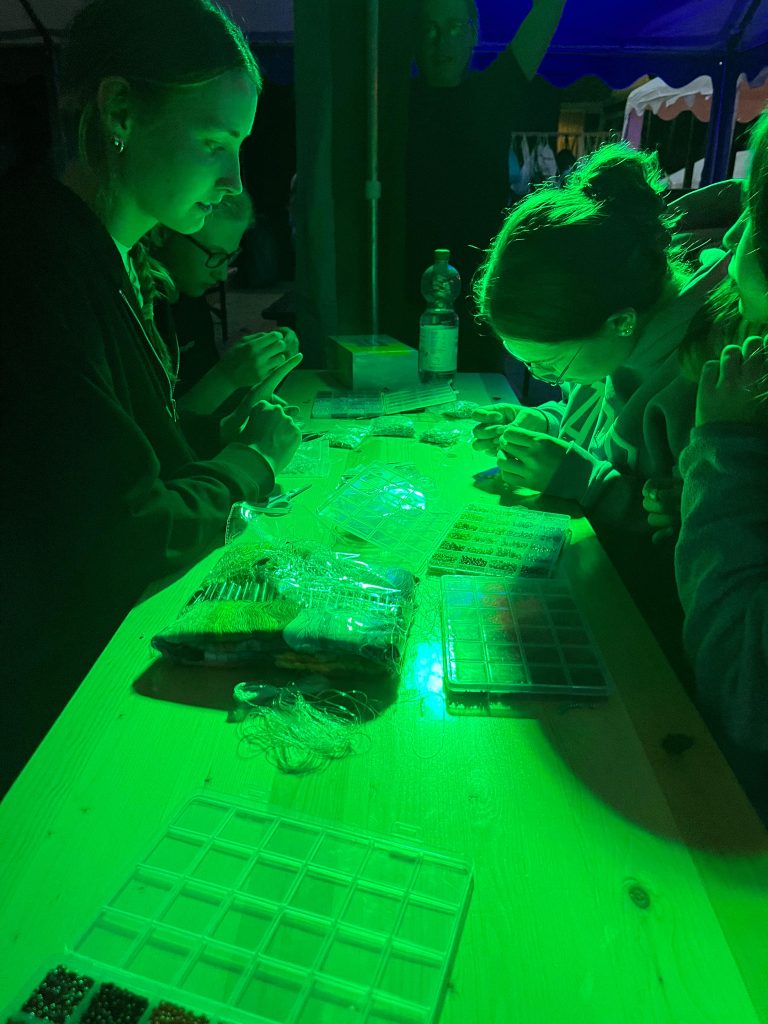 Am Abend wurde das Zeltlager dann in einen kunterbunten Hippie-Markt verwandelt. Überall gab es etwas zu entdecken: Wahrsagerinnen lasen aus Karten, bunte Armbänder wurden geknüpft, Töpferkunst entstand, Pferderennen wurden ausgetragen  und sogar ein Boxautomat testete die Kräfte der Zeitreisenden. Die Stimmung? Locker, fröhlich und frei – ganz im Sinne des Hippie-Gedankens.